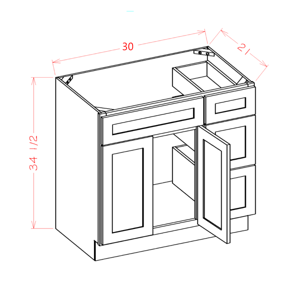 The Shaker Navy Blue 30" vanity combo with drawers on the right is 21" deep. It includes 1 door, 3 right drawers and 1 top false front drawer.