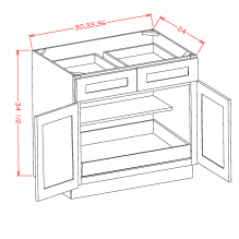 The Shaker Navy Blue 33" Base Cabinet w/ 1 Rollout Shelf is 34-1/2" high and 24" deep. It comes with 2 doors, 2 drawers and 1 rollout shelf.