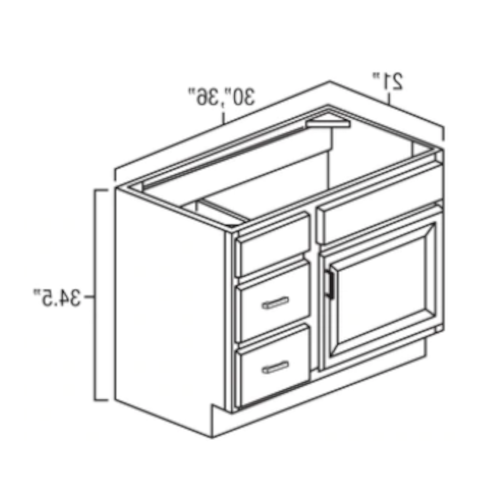 Soda 30" W x 34.5" H x 21" D single door vanity sink base with 2 drawers on the left.