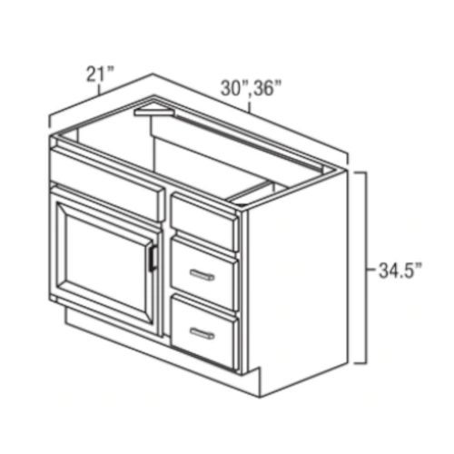 Toffee Shaker 30" W x 34.5" H x 21" D single door vanity sink base with 2 drawers on the right.